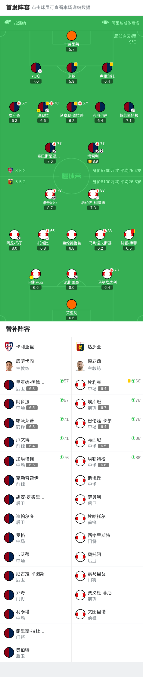 11-22 22:50卡利亚里vs热那亚:米纳、塞巴斯蒂亚诺-埃斯波西托首发,马利诺夫斯基、洛伦佐-科隆博出战