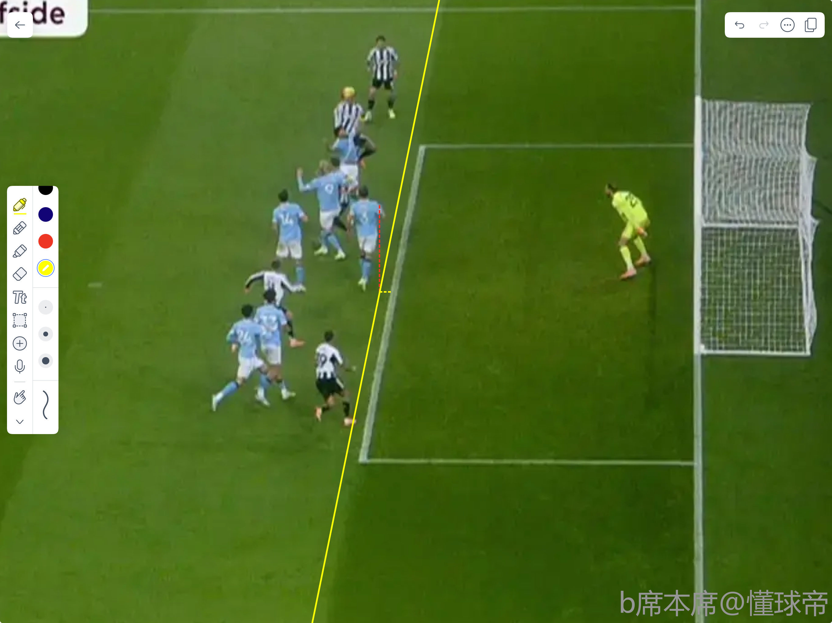 自己画了个线,这甚至是没有怎么考虑透视,和小禁区线基本平行的。用透视校准之后只会越更多