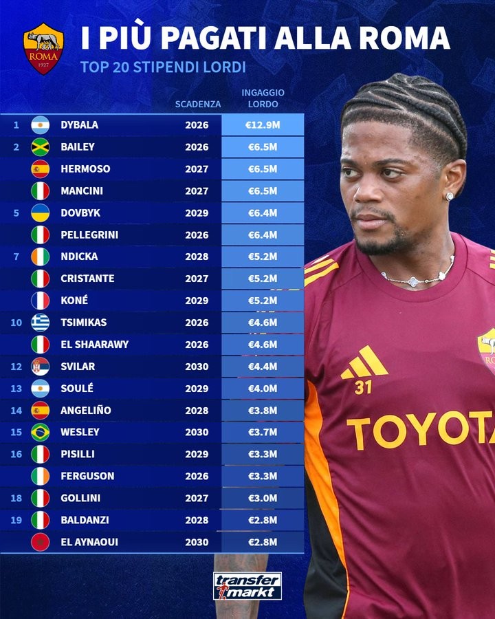 北京时间11月23日,德转列出了本赛季罗马队内税前年薪最高的20名球员,迪巴拉以1290万欧元高居第一,利昂-贝利、埃尔莫索、詹卢卡-曼奇尼同以650万欧元并列第二。