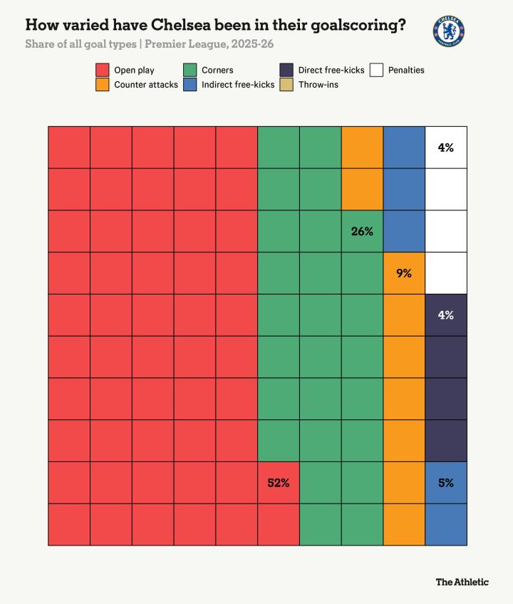 目前切尔西队中没有人能真正被描述为可靠的得分手——但他们的进球产出并未受到影响。通过中锋的“唯一路径”尚未结出硕果,但他们已经找到了许多其他途径。