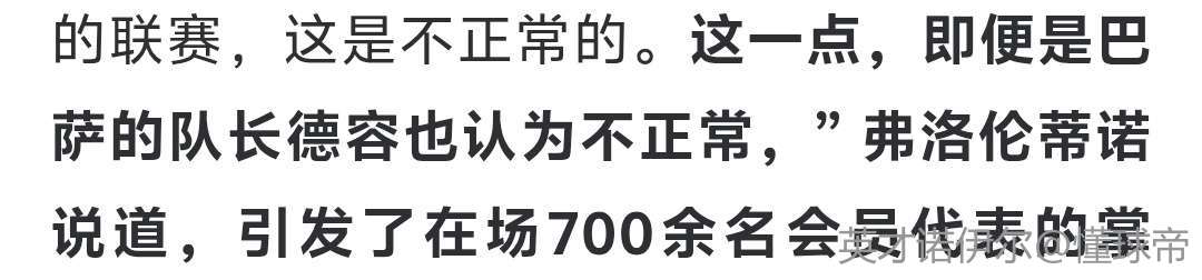 “西甲联盟主席推动一场在西班牙境外举办的联赛,这是不正常的。这一点,即便是巴萨的队长德容也认为不正常,” 弗洛伦蒂诺说道,引发了在场700余名会员代表的掌声。“西甲联盟支持巴萨和比利亚雷亚尔这两支球队通过在迈阿密参赛获得额外经济注入,这同样不正常,”皇马主席辩解道。