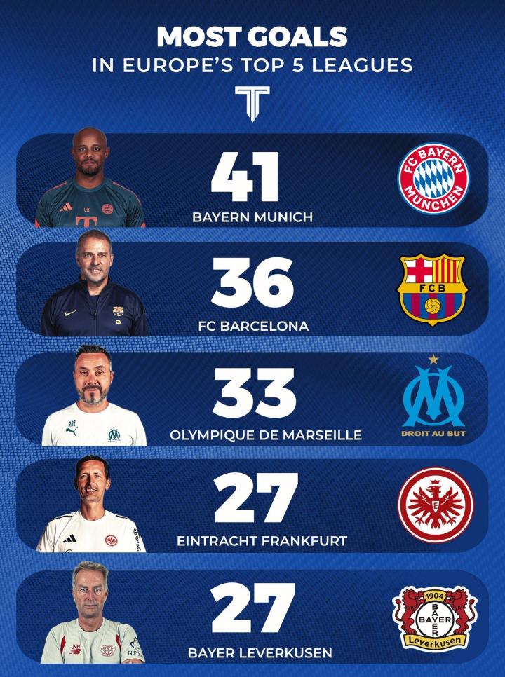 扫描下载懂球帝首页>动态> 本赛季五大联赛俱乐部进球榜TOP5:拜仁11轮41球第1,巴萨第2
