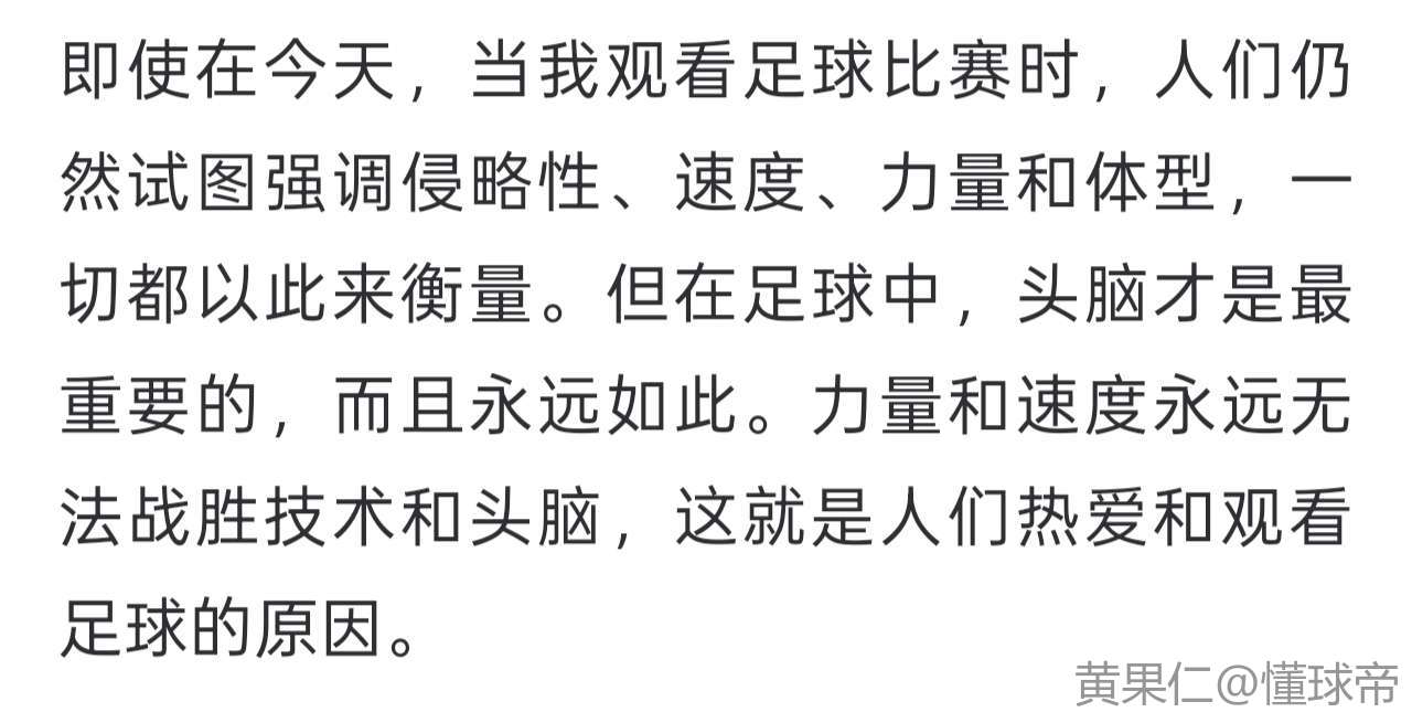 即使在今天,当我观看足球比赛时,人们仍然试图强调侵略性、速度、力量和体型,一切都以此来衡量。但在足球中,头脑才是最重要的,而且永远如此。力量和速度永远无法战胜技术和头脑,这就是人们热爱和观看足球的原因。