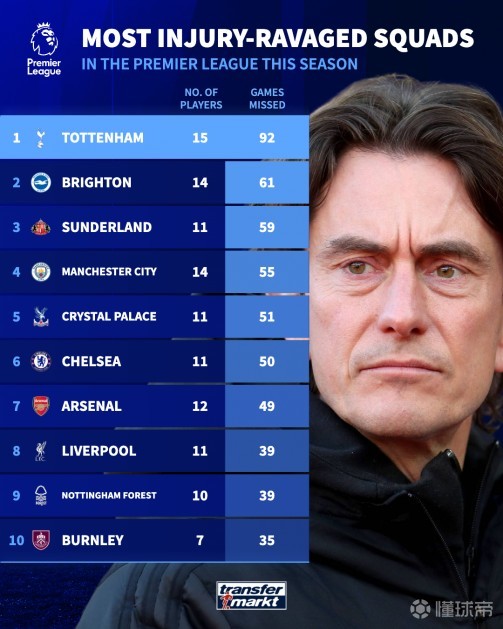 扫描下载懂球帝首页>动态> 德转列本赛季英超伤病榜:热刺15人受伤合计缺席92场排名第一