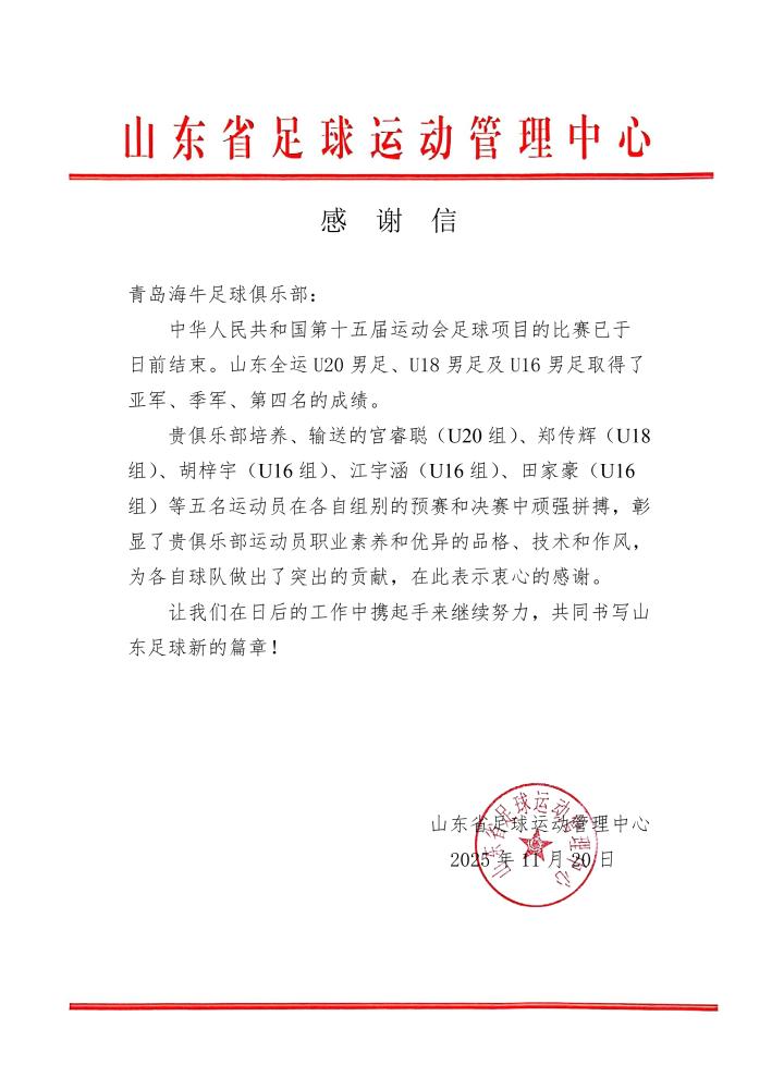 扫描下载懂球帝首页>动态> 海牛五将助力山东全运队,山东省足球运动管理中心发来感谢信