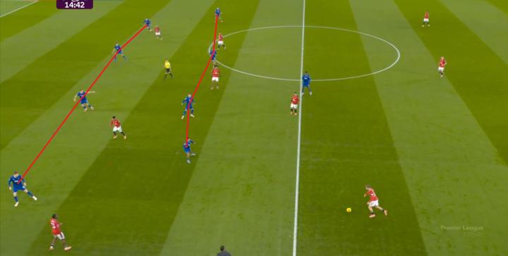 这里存在的一个变量,是此前的界外球进攻当中,埃弗顿的双中卫都来到了前场,所以在埃弗顿把球送回后场运转的时候,曼联的前场球员先是没有进行逼抢,随后在基恩后撤的时候,卡塞米罗随之移动,从而露出了他和布鲁诺之间,可以联系到霍尔的线路: