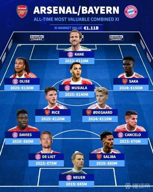 扫描下载懂球帝首页>动态> 德转列阿森纳+拜仁历史最贵阵容:萨卡、穆西亚拉、凯恩领衔
