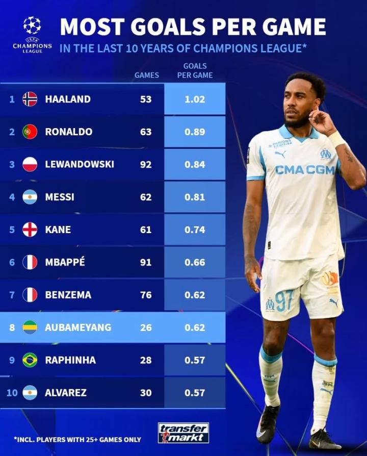 扫描下载懂球帝首页>动态> 近10年欧冠场均进球榜:哈兰德1.02球第1,C罗第2,梅西第4