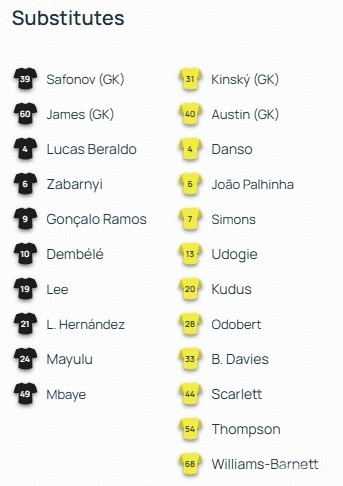 巴黎战热刺大名单:登贝莱回归,维蒂尼亚、内维斯在列