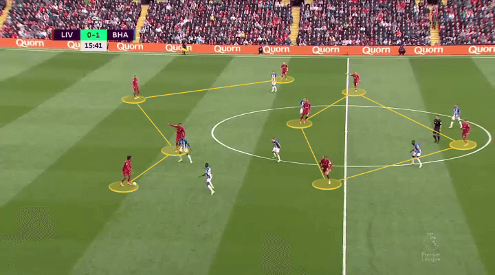 其他体系也以不同方式呈现出类似菱形的形状。例如,克洛普的利物浦使用菲尔米诺作为伪9号,而萨拉赫和马内则是主要的边路得分手。这难道不是菱形阵型的一个实际例子吗?