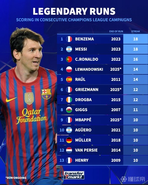 扫描下载懂球帝首页>动态> 欧冠连续赛季进球纪录:本泽马、梅西连续18赛季进球第1