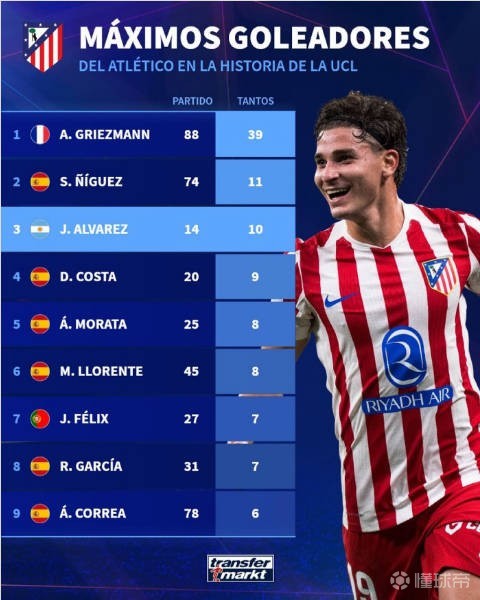 扫描下载懂球帝首页>动态> 马竞队史欧冠进球榜:格列兹曼39球居首,小蜘蛛10球位列第三