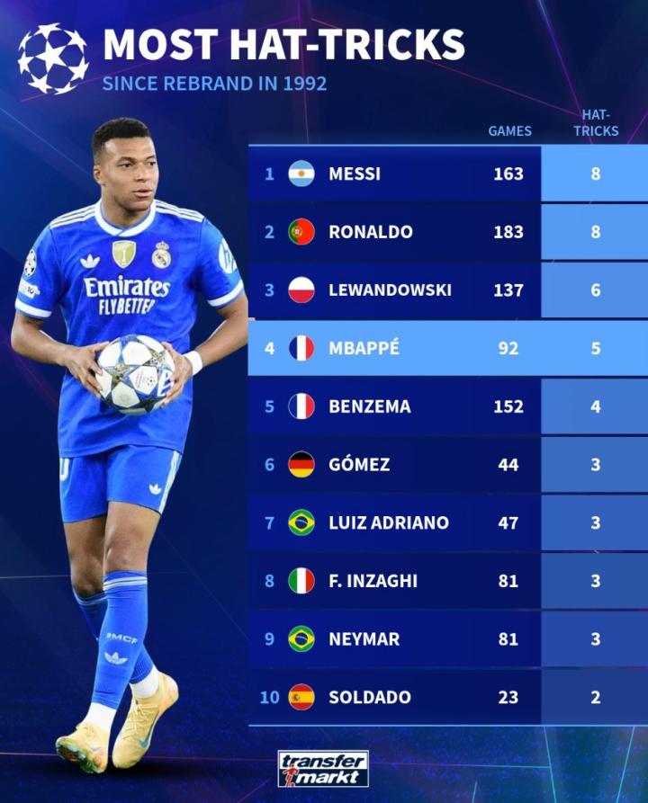 姆巴佩欧冠生涯已5次戴帽,仅次于梅西、C罗和莱万