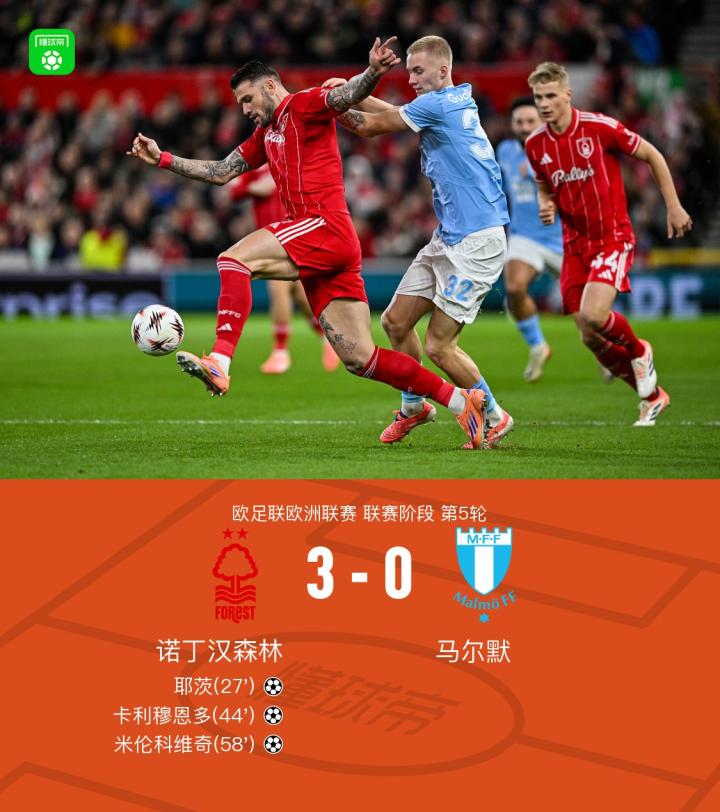 北京时间11月28日,欧足联欧洲联赛联赛阶段第5轮,诺丁汉森林迎战马尔默。比赛中,耶茨率先为球队打破僵局,帮助诺丁汉森林取得领先。随后,卡利穆恩多接队友配合后攻入一球,进一步扩大比分优势。下半场,米伦科维奇在进攻中把握机会,将球送入对方球门,为球队锁定胜局。全场比赛结束,最终比分为诺丁汉森林3-0马尔默。