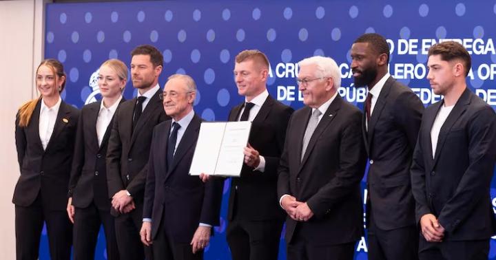 托尼-克罗斯从职业足球退役已经过去一年半,他在足坛留下的影响依然巨大,各种向这位德国前中场致敬的活动持续不断。去年七月,他已获得德国梅克伦堡-前波美拉尼亚州授予的功绩勋章,该州正是他家乡格赖夫斯瓦尔德所在地区。本周四,他又在马德里伯纳乌球场的贵宾包厢内,从德国总统弗兰茨-瓦尔特-施泰因迈尔手中,接受了德意志联邦共和国功绩勋章骑士十字勋章。这是一场带有德国荣誉象征意义的仪式,却选择在马德里、在伯纳乌举行,原因有二:一方面,克罗斯把西班牙首都视为自己的家,退役后继续定居于此,并在博阿迪利亚-德尔蒙特创办了自己的足球学院;另一方面,皇家马德里是他职业生涯的俱乐部归宿,他在这里效力了十个赛季。因此,除了他的家人外,皇马主席弗洛伦蒂诺也到场祝贺。