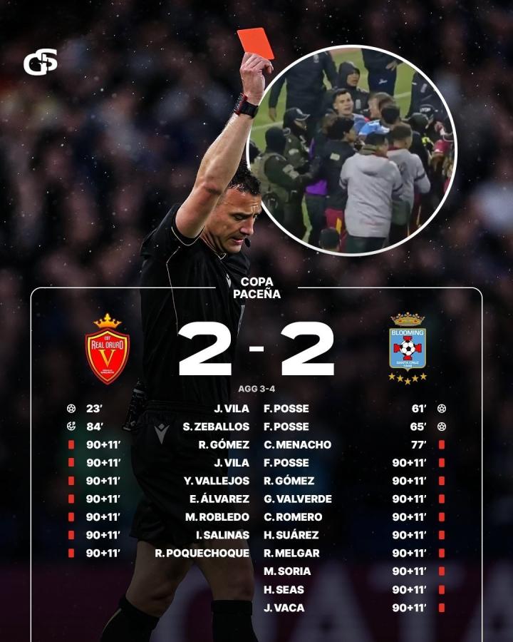 北京时间11月26日,玻利维亚杯1/4决赛,皇家奥鲁罗2-2战平布鲁明。在比赛结束后,双方爆发大规模冲突,导致17人被罚下场。