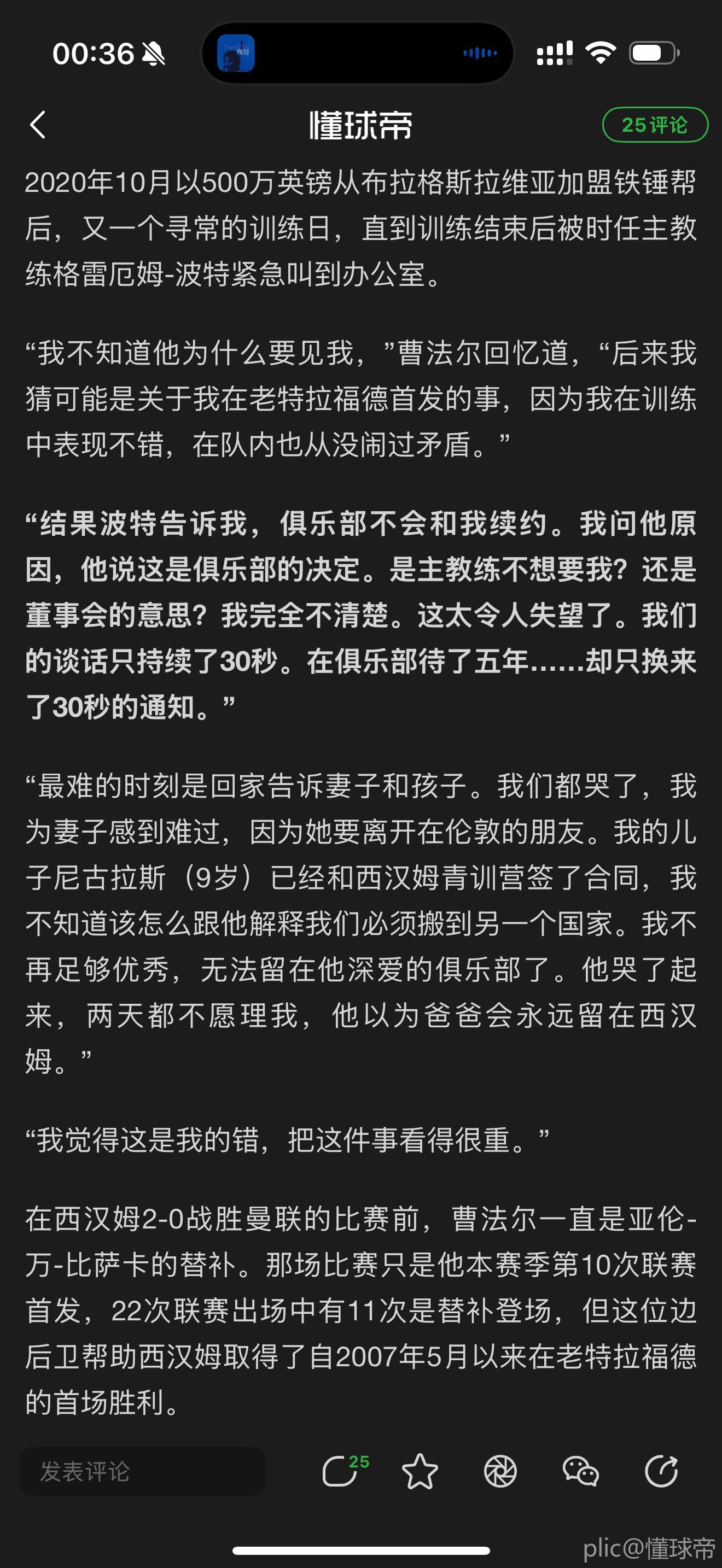 日前曹法尔接受了TA的采访,本文为采访的第一部分,他袒露了被西汉姆解约后的复杂心绪。效力五年、助力球队夺得欧协联冠军的他,突然收到解约通知,而且谈话只持续了30秒,他表示对此至今难以释怀。