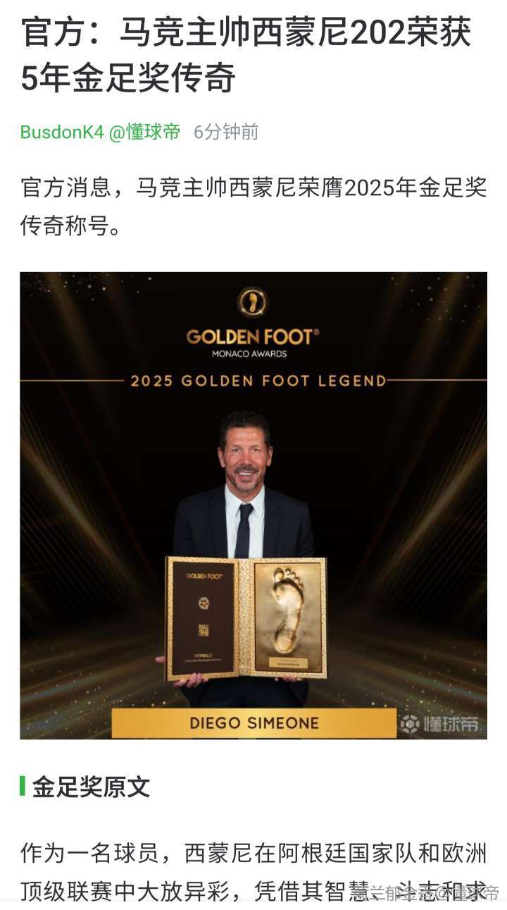 扫描下载懂球帝首页>动态> 官方:马竞主帅西蒙尼荣获2025年金足奖传奇