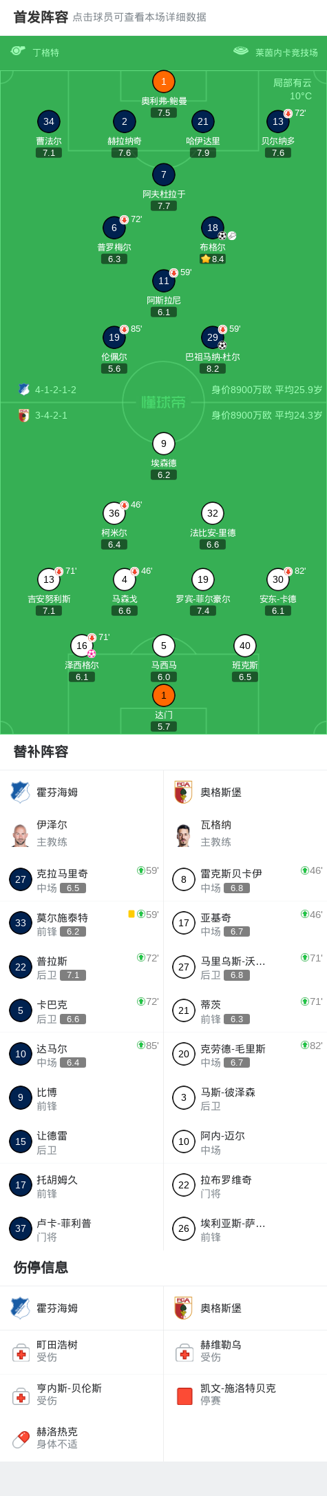 11-29 23:18霍芬海姆vs奥格斯堡:曹法尔、奥利弗-鲍曼首发,法比安-里德、泽西格尔出战