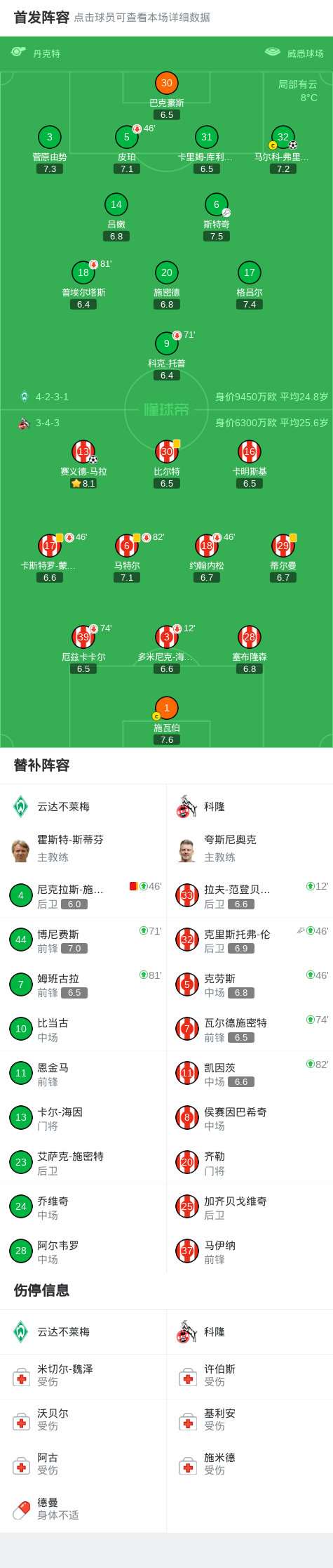 下半场补时第1分钟,科隆球员克里斯托弗-伦助攻赛义德-马拉打入一球。