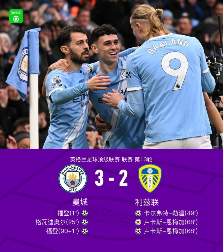 扫描下载懂球帝首页>动态> 剑南春|曼城3-2利兹联,福登双响+绝杀,格瓦迪奥尔破门+送点