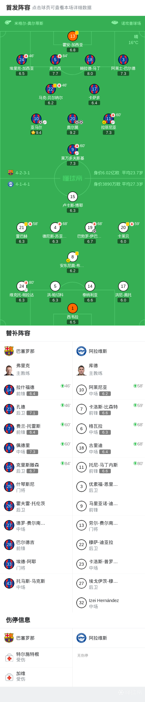 11-30 01:45西媒:埃里克-加西亚因上半场面部受撞击后头晕在半场被换