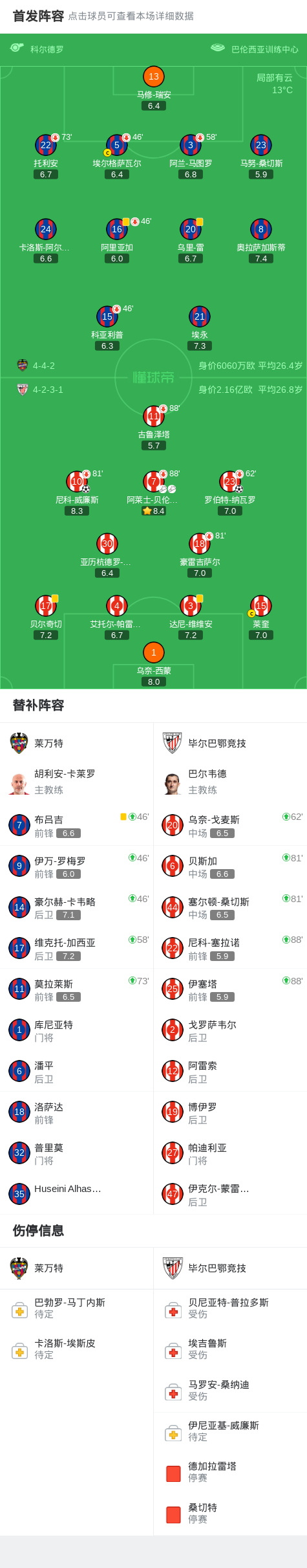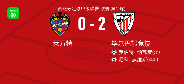 北京时间11月30日,西班牙足球甲级联赛第14轮,莱万特主场迎战毕尔巴鄂竞技。比赛中,阿莱士-贝伦格尔送出两次助攻,罗伯特-纳瓦罗接应破门为球队首开纪录。随后,尼科-威廉斯在上半场再下一城,帮助毕尔巴鄂竞技扩大领先优势。全场比赛结束,最终比分莱万特 0-2 毕尔巴鄂竞技。