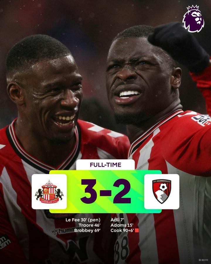 11-30 01:14桑德兰3-2逆转伯恩茅斯,布罗贝伊制胜,泰勒-亚当斯超远吊射