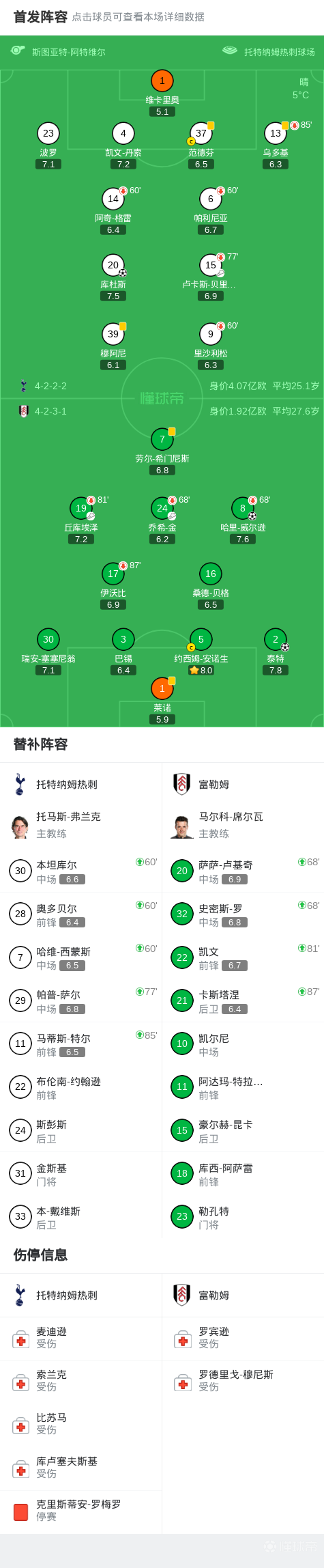 热刺vs富勒姆:里沙利松、穆阿尼首发,库杜斯、范德芬出战