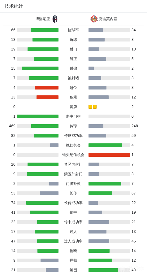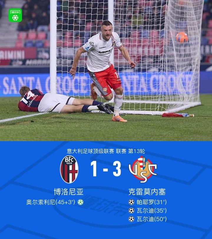 北京时间12月2日意大利足球顶级联赛 联赛 第13轮,博洛尼亚主场对阵克雷莫内塞。博洛尼亚奥尔索利尼破门。克雷莫内塞帕耶罗破门,瓦尔迪梅开二度。最终比分博洛尼亚 1-3 克雷莫内塞。