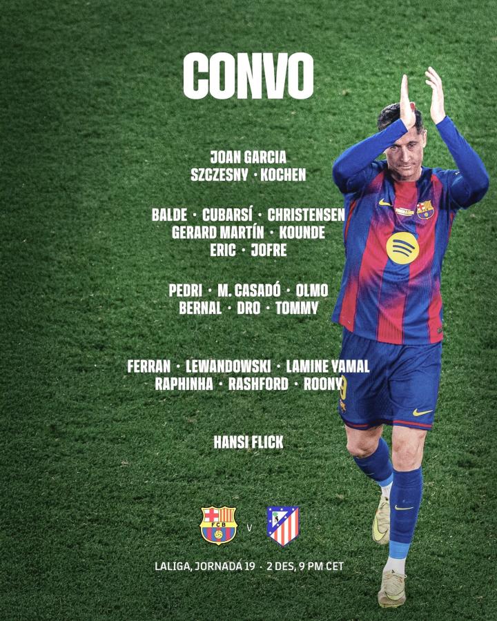 巴萨对阵马竞大名单:莱万、拉菲尼亚、亚马尔领衔,德容缺阵