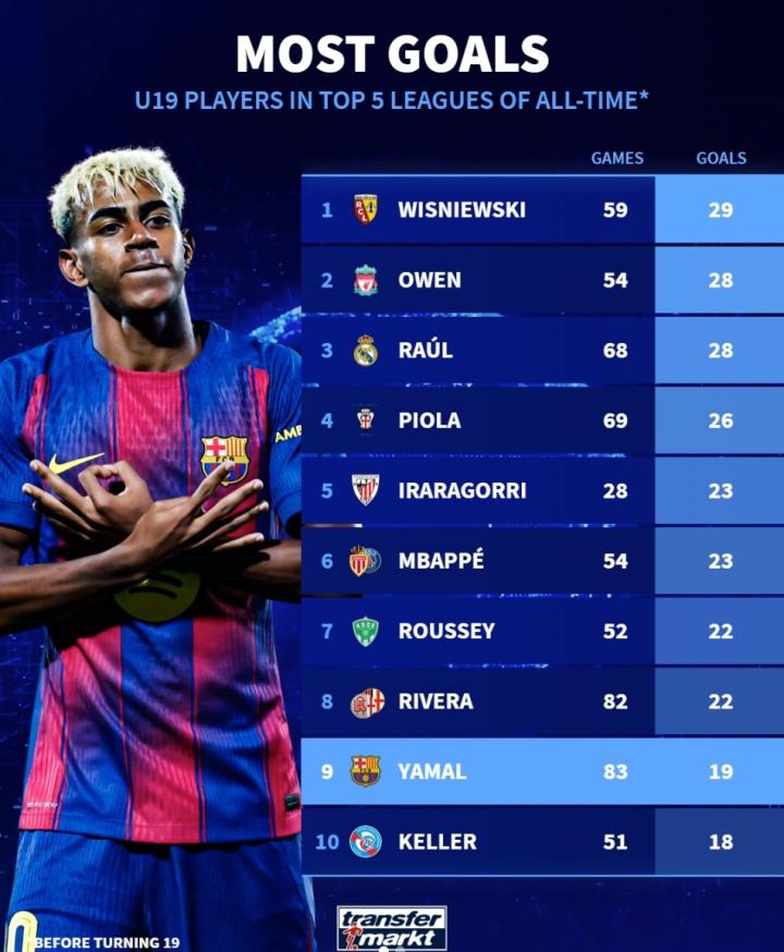 扫描下载懂球帝首页>动态> 五大联赛历史U19进球榜:欧文、劳尔、姆巴佩、亚马尔上榜