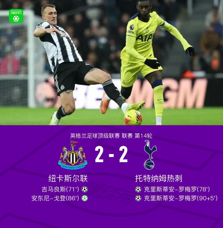 扫描下载懂球帝首页>动态> 剑南春|纽卡2-2热刺,罗梅罗梅开二度+倒钩破门,戈登点射