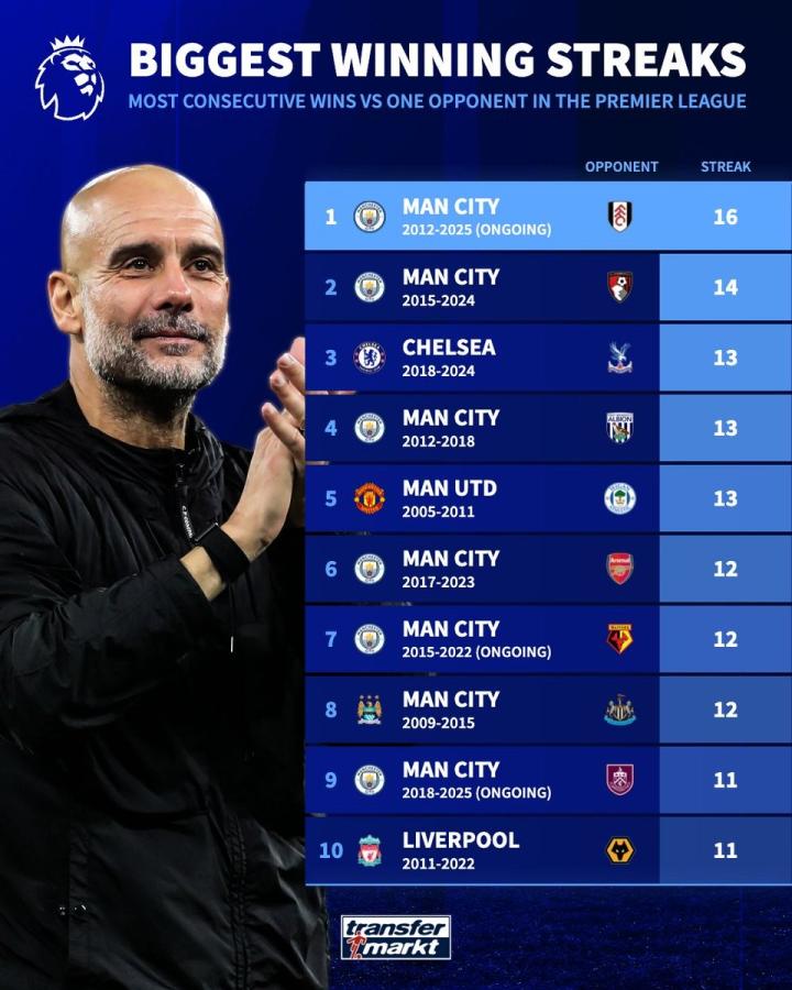 扫描下载懂球帝首页>动态> 英超对同一球队最长连胜排行:曼城对富勒姆16连胜居首