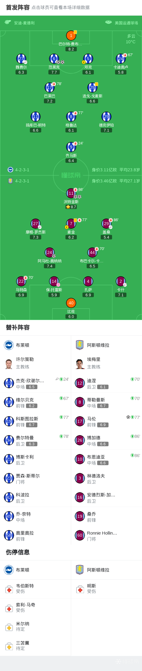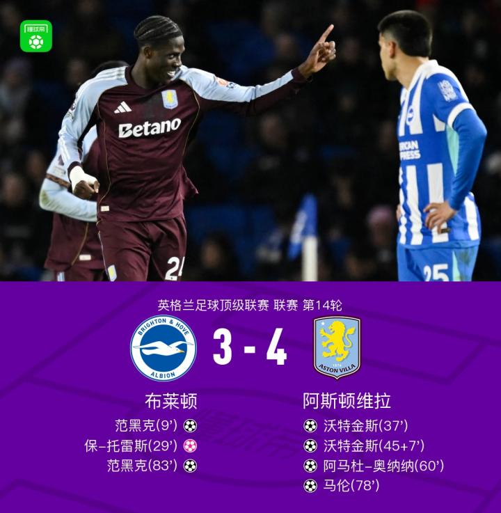 扫描下载懂球帝首页>动态> 维拉客场4-3逆转布莱顿,沃特金斯双响,范黑克2球难救主