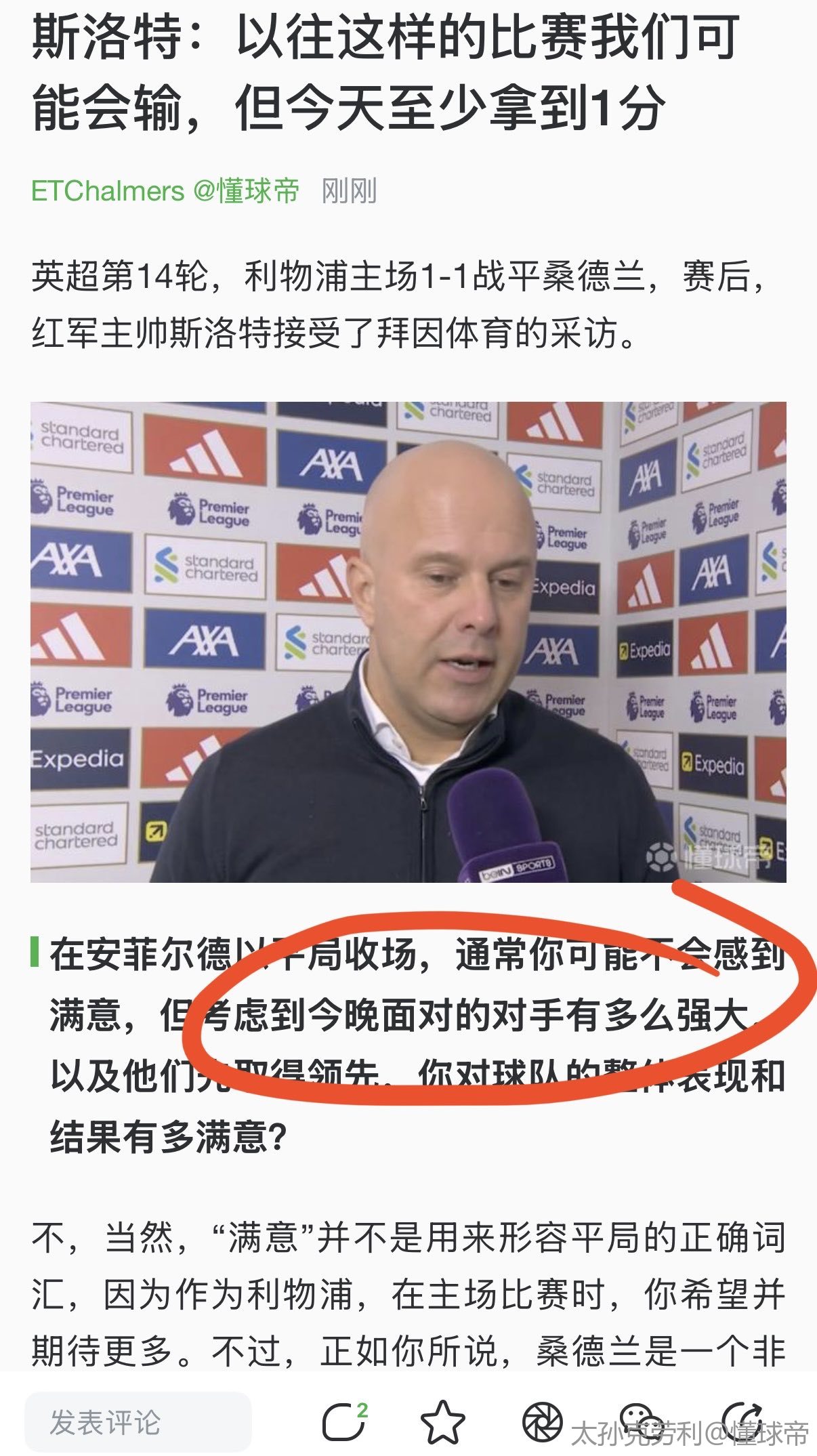 12-04 07:25斯洛特:对方的进球在我看来不算是机会,否则我们有20次机会