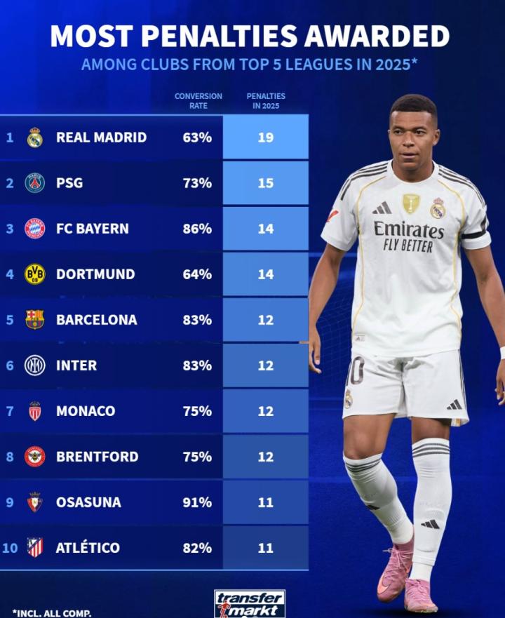 扫描下载懂球帝首页>动态> 2025年五大联赛俱乐部获得点球数TOP10:皇马、巴黎、拜仁前3