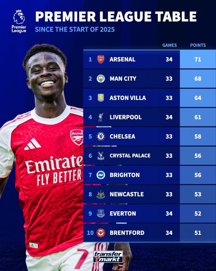 扫描下载懂球帝首页>动态> 2025年英超积分排行:枪手71分居首,曼城68分第二,维拉第三