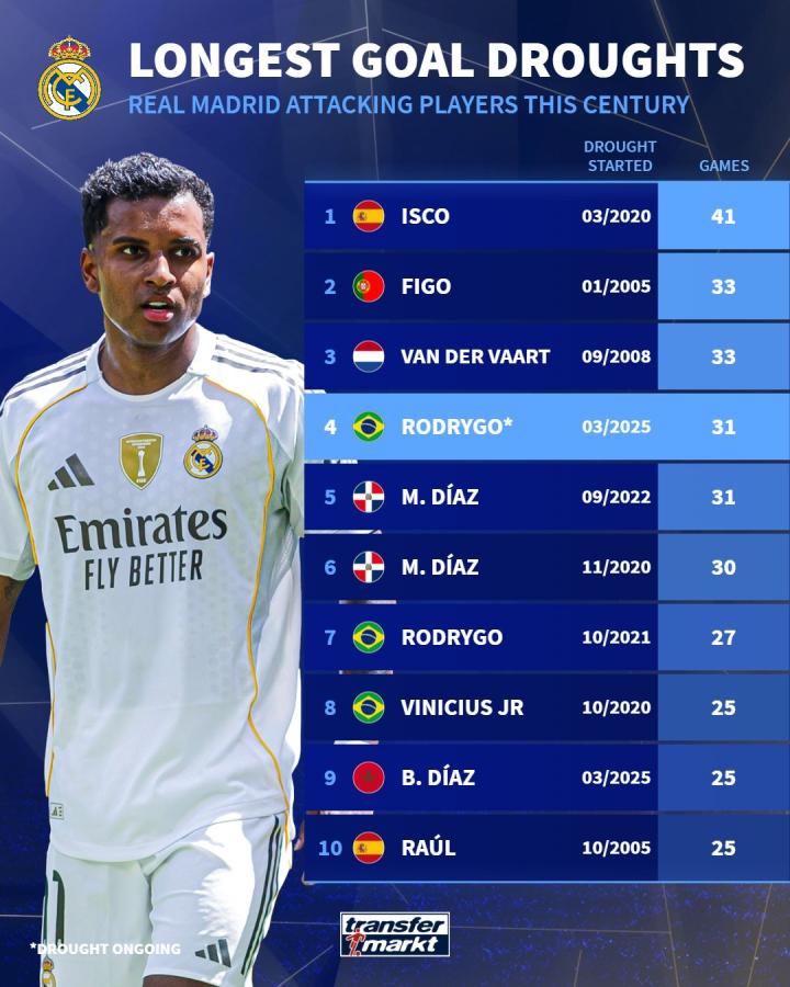 扫描下载懂球帝首页>动态> 本世纪皇马攻击手最长进球荒排行:罗德里戈目前31场列第四