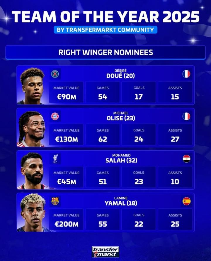 扫描下载懂球帝首页>动态> 德转评年度最佳右边锋:杜埃、奥利塞、萨拉赫、亚马尔入围