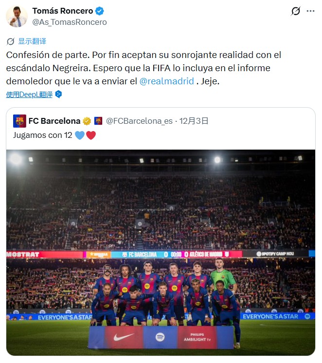 扫描下载懂球帝首页>动态> 龙赛罗转发巴萨“第12人”贴文:他们承认了内格雷拉丑闻