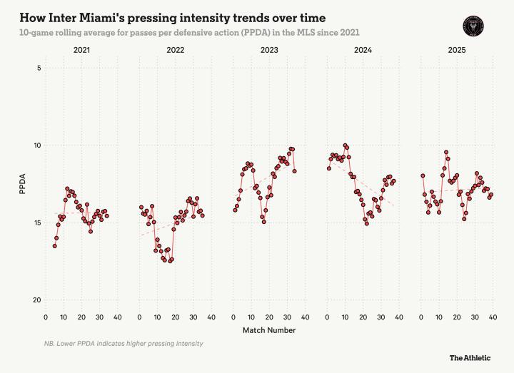 在本赛季美职联前锋中,梅西在“每90分钟在进攻三区夺回球权”这项反映反抢能力的指标上排名第十,这支持了马斯切拉诺的观点。他并非覆盖每条通道,而往往是设定第一道压迫线的人,这表明他理解自己在这项联赛中的防守职责。身边有了更年轻的队友,这种站位选择的益处便被放大了。