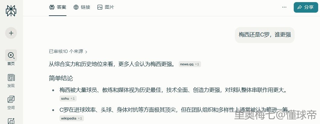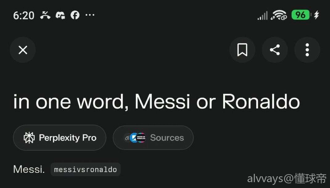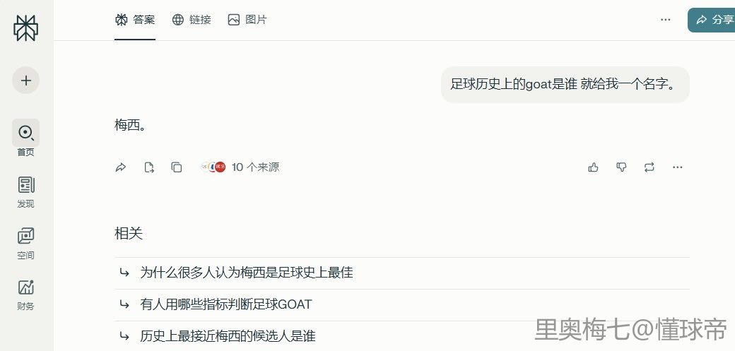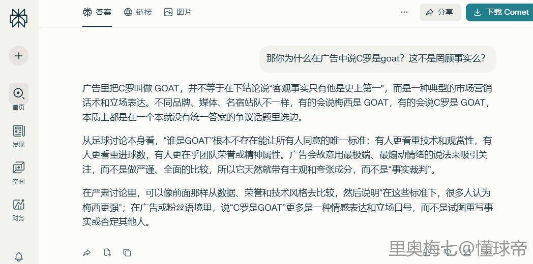 问了这个Perplexity AI 3个问题,回答还挺诚实的。说C罗是GOAT只是情感表达和立场口号,不是事实,哈哈哈