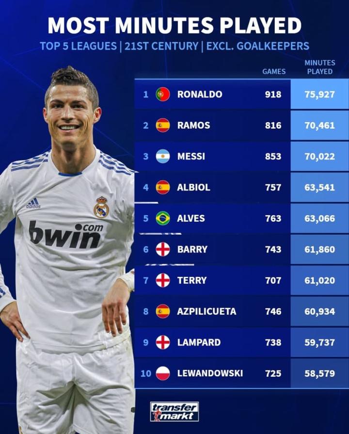 扫描下载懂球帝首页>动态> 21世纪五大联赛外场球员出场时间榜:C罗、拉莫斯、梅西前3