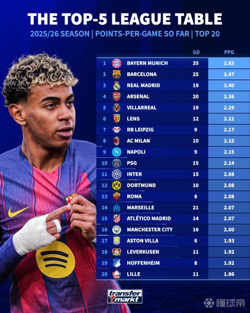 扫描下载懂球帝首页>动态> 本赛季五大联赛场均积分前20:拜仁、巴萨、皇马、阿森纳前4