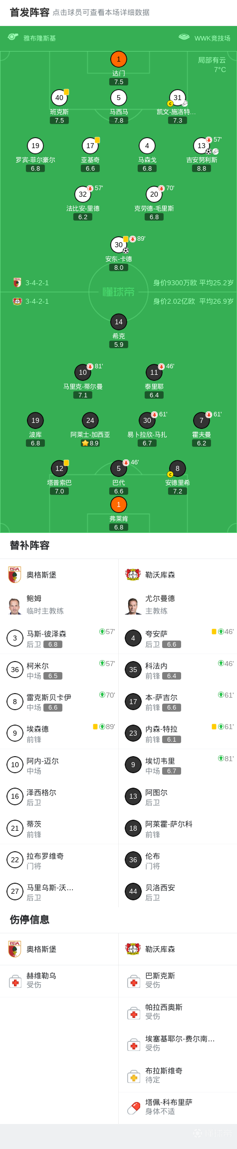 北京时间12月6日22:30,德甲第13轮,奥格斯堡主场迎战勒沃库森。比赛开局阶段,凯文-施洛特贝克送出精准助攻,吉安努利斯冷静破门,为奥格斯堡先拔头筹。随后,吉安努利斯在送出关键传球帮助安东-卡德推射得手,进一步扩大领先优势。此后双方均未能改写比分,药厂全场击中门框三次,最终奥格斯堡以2-0战胜勒沃库森。