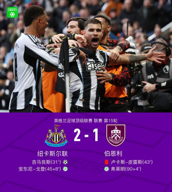 12-07 00:01半场:纽卡2-0伯恩利,吉马良斯角球破门,戈登点射,皮雷斯染红