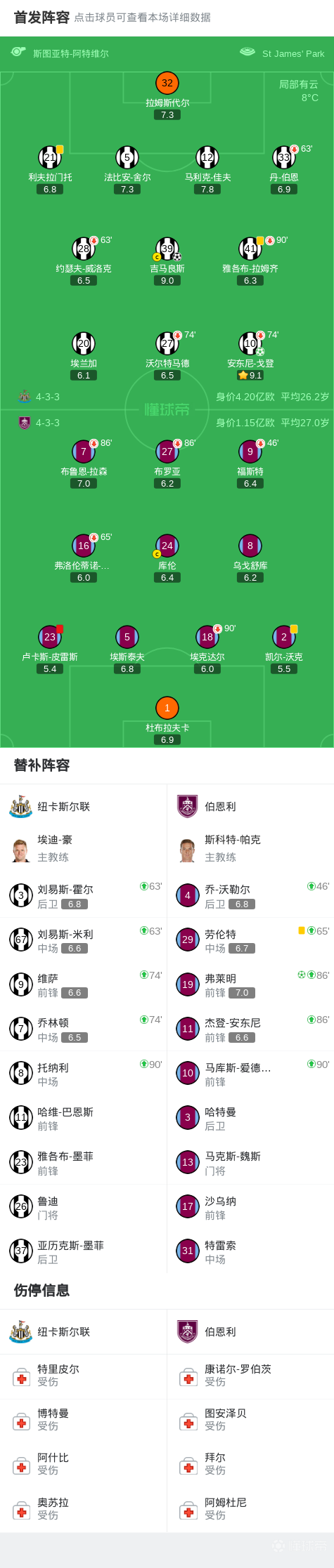 纽卡斯尔联 vs 伯恩利 比赛动态