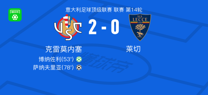 懂球帝首页>动态> 克雷莫内塞2-0莱切,博纳佐利建功,萨纳夫里亚锁定胜局