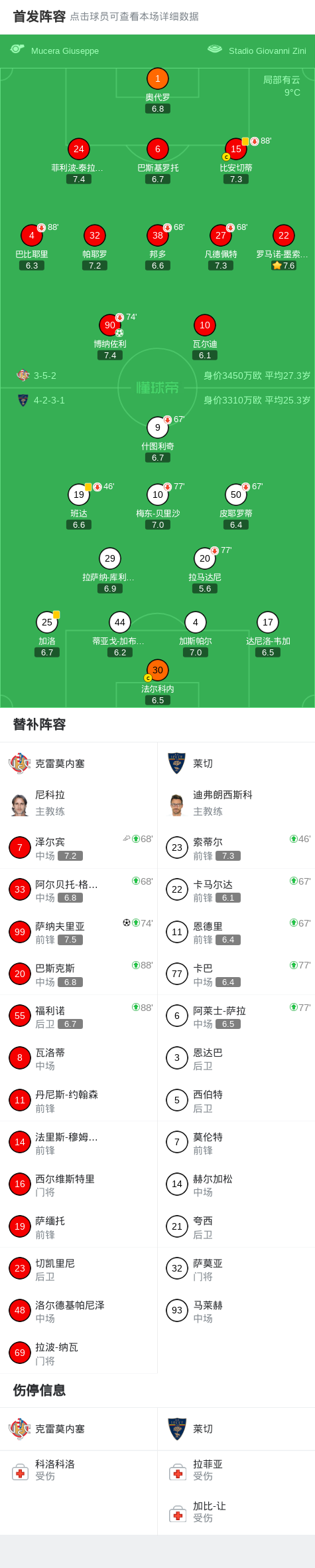 克雷莫内塞vs莱切:瓦尔迪、奥代罗首发,班达、法尔科内出战
